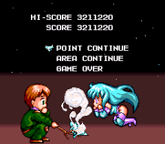 Mais il est une autre différence, moins connue, entre les versions US/Euro et Japonaise. Dans la version originale, il existe des séquences qui ont été tout simplement supprimées en Europe et aux USA. Dans la scène d’intro, on peut ainsi voir les deux pilotes du vaisseau. Un homme et une femme, très typés « manga » ! Et on les retrouve aussi sur l’écran de game-over, en mode SD, en train de faire griller leur vaisseau sur un feu de bois.