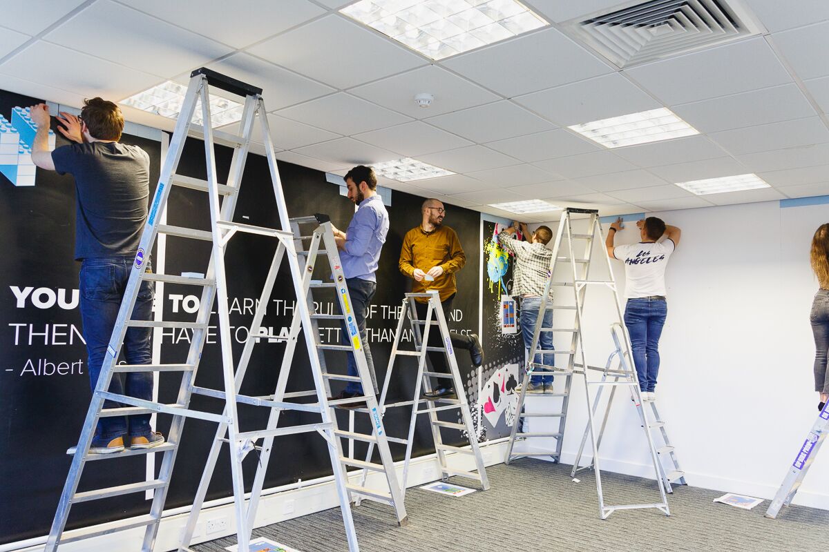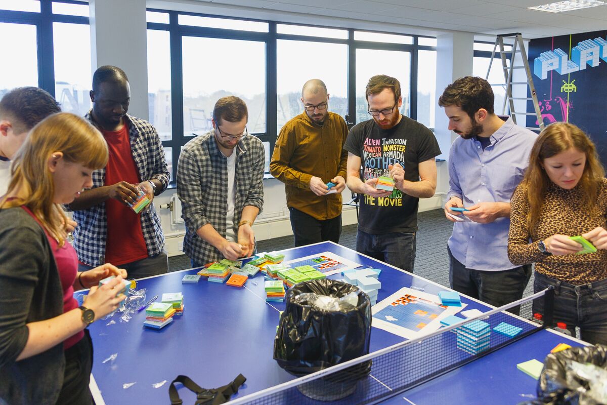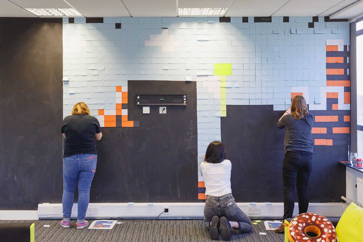 Réunir tous les Post-It, c’est bien ! Mais encore faut-il les coller. Pour cela, une équipe de dix employés ont consacré 7 heures chacun, sur leur pause déjeuner notamment, pour se mettre au collage.