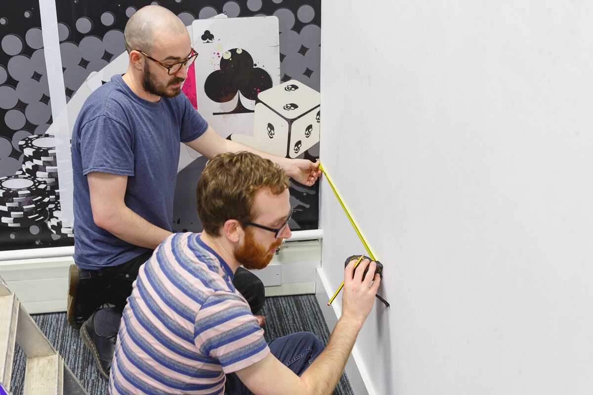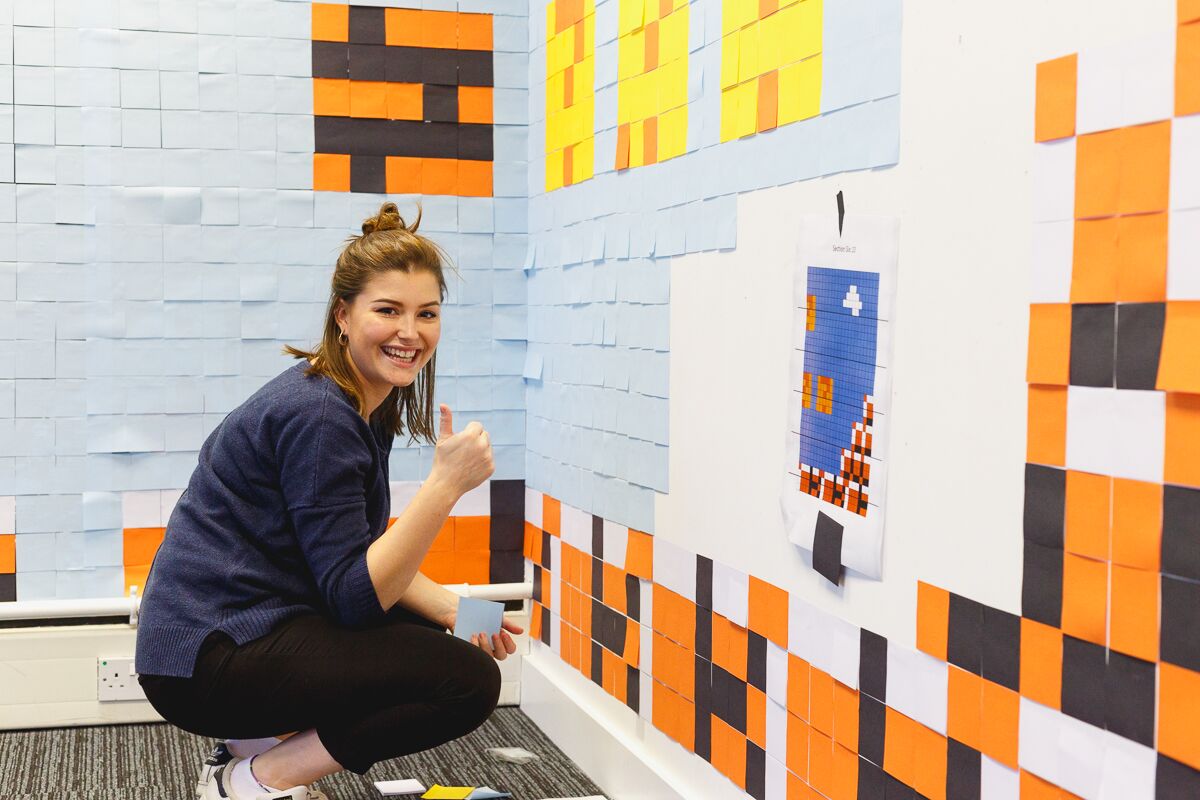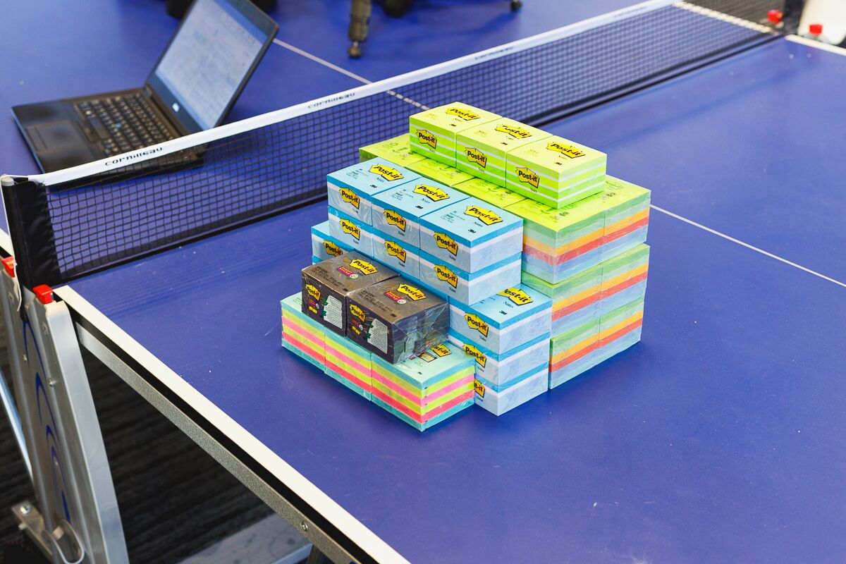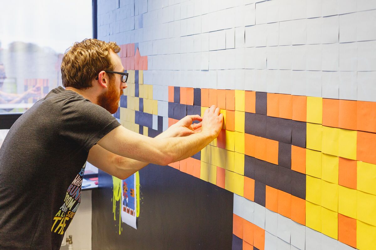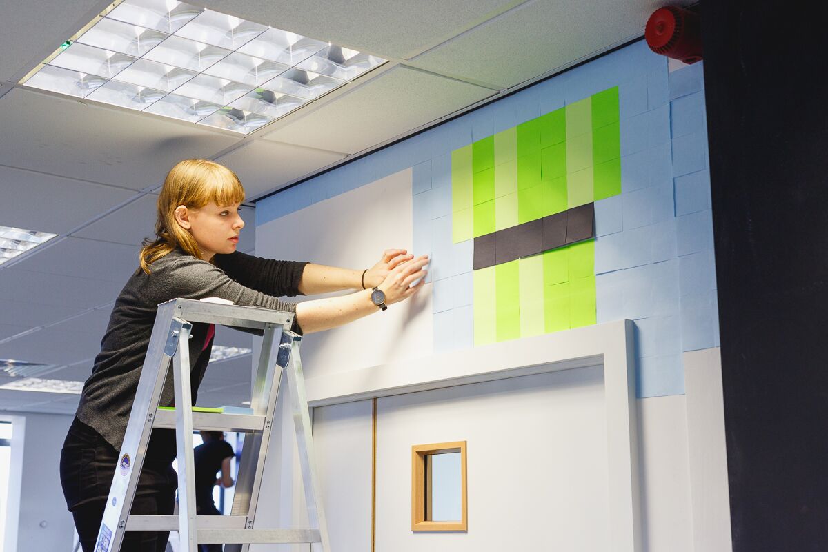 Le projet peut sembler fun, au premier abord. Mais aura demandé une organisation au millimètre ! Et de savants calculs. Il aura fallu une journée entière aux créatifs pour calculer les dimensions des petits pense-bêtes autocollants, et des murs (d’une hauteur de 31 Post-It). Ce pour évaluer le nombre de carrés de couleur nécessaires à 7000.
