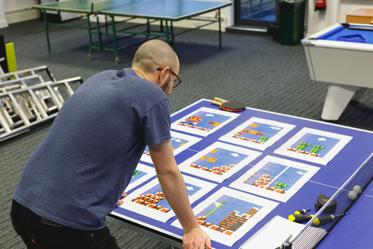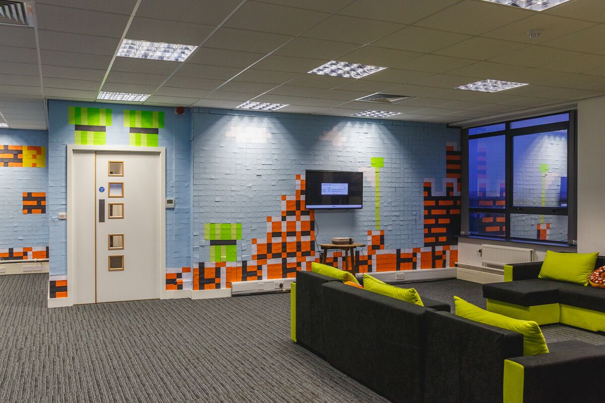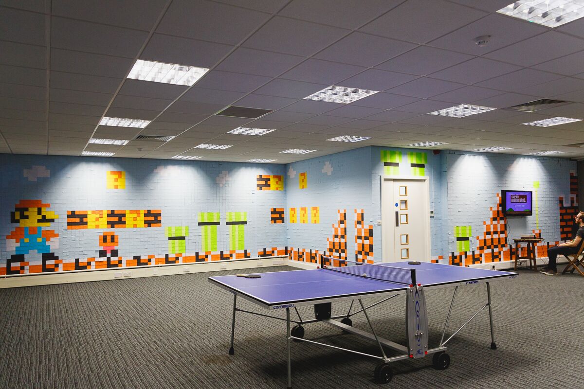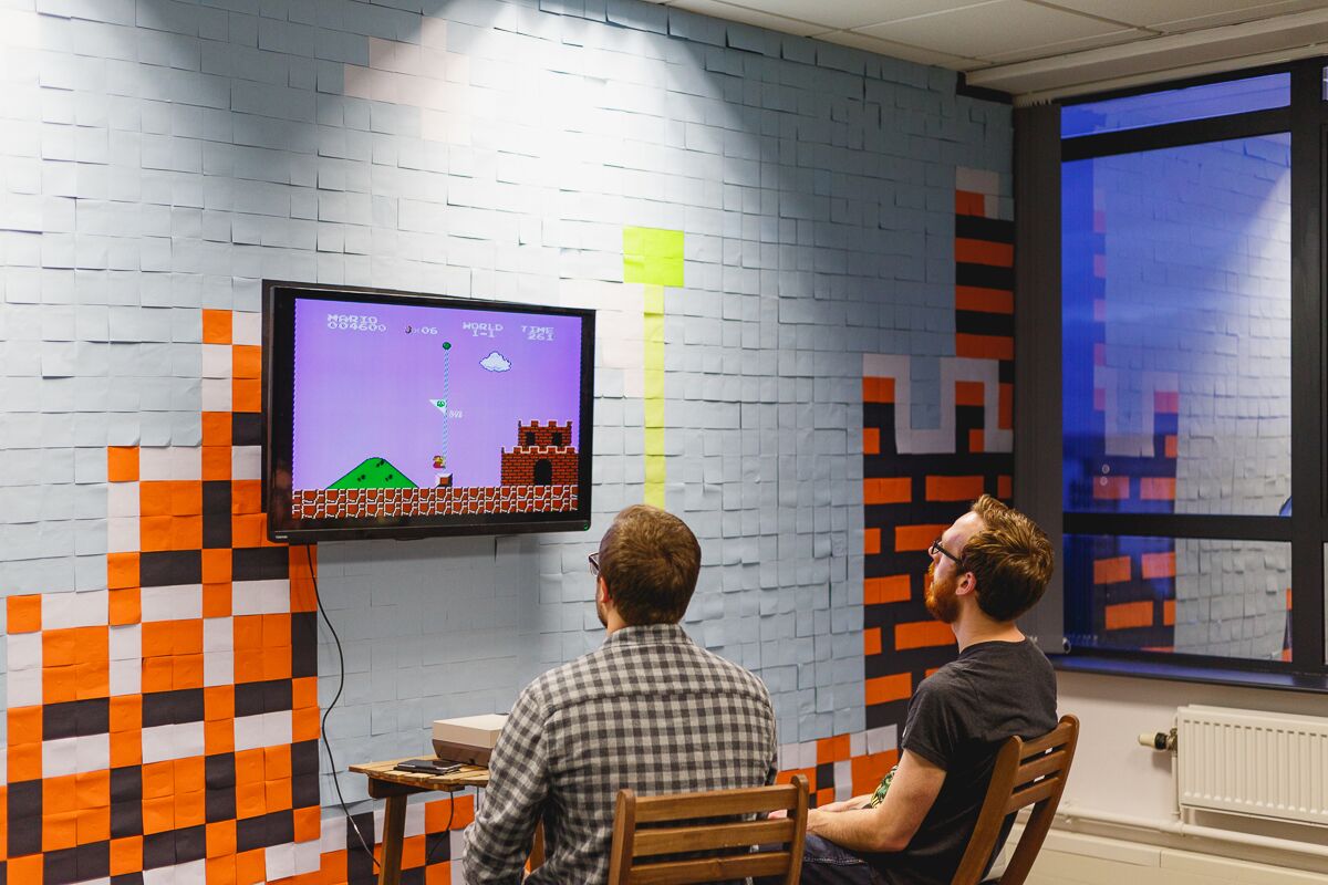 Le projet peut sembler complètement dingue ! Mais laisse deviner la bande de fans de Mario, complètement furieux, qui se cachent derrière… Quelques semaines après la sortie de Super Mario Odyssey, Viking France a entièrement recouvert les murs de sa salle de pause avec des Post-It. Recréant ainsi le célèbre niveau 1-1 de Super Mario Bros. Notez que les salariés ont réalisé cette fresque sur leur temps libre.