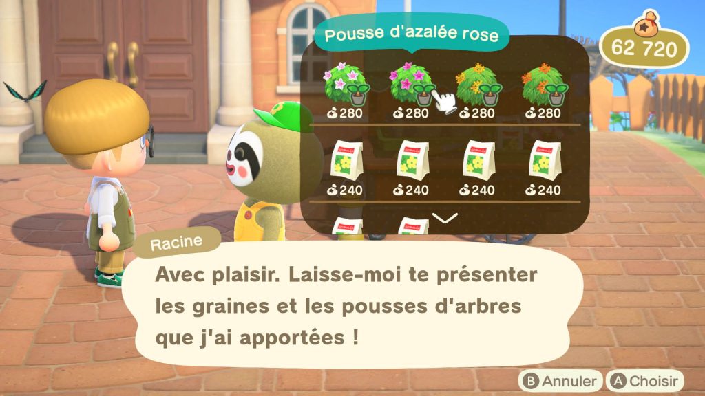 Racine ouvre son stand. – Racine, l’ami de la nature, se rendra régulièrement sur votre île pour y vendre toutes sortes d’articles tels que des pousses d’arbustes, des graines de fleurs, ou encore des buissons.