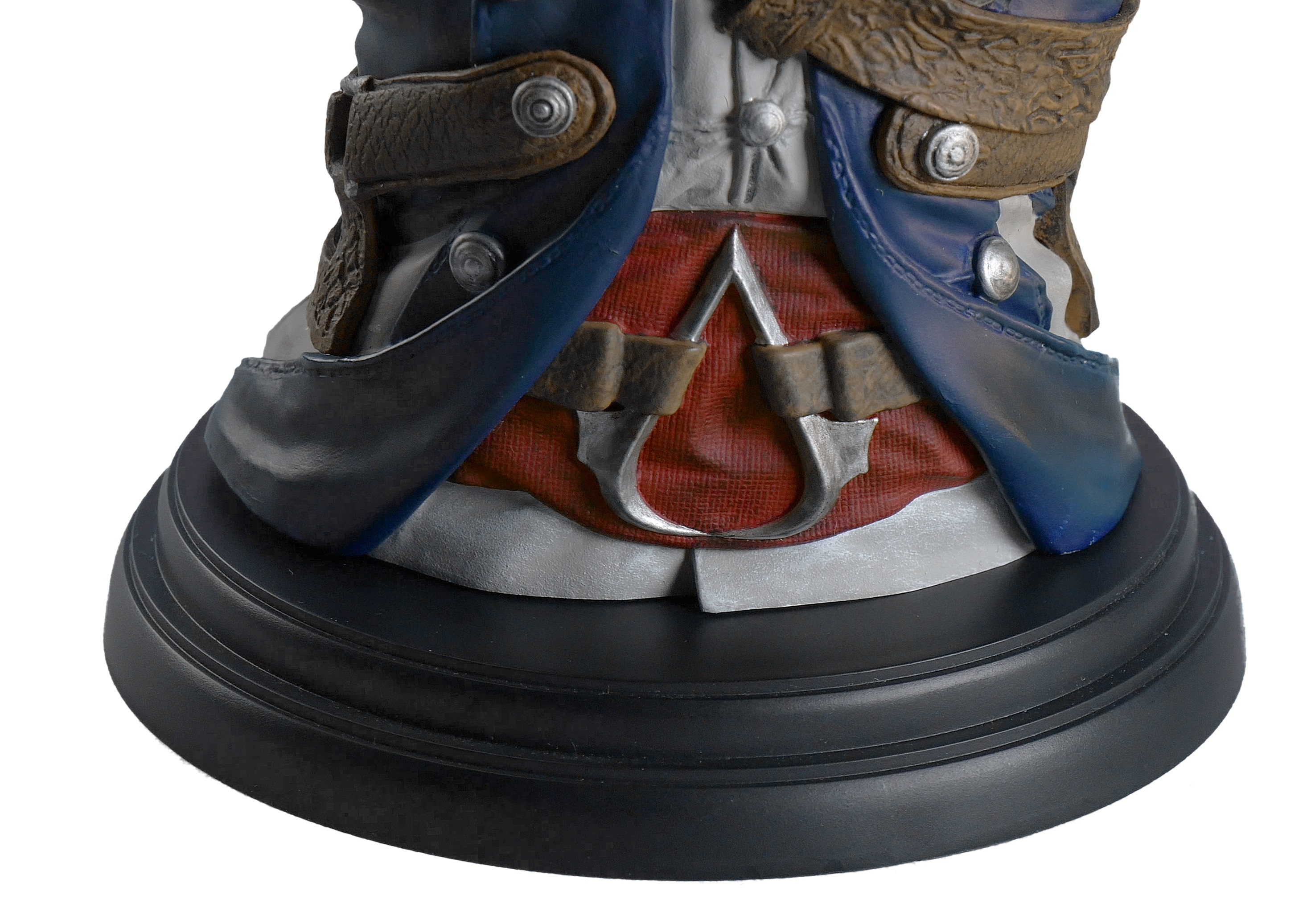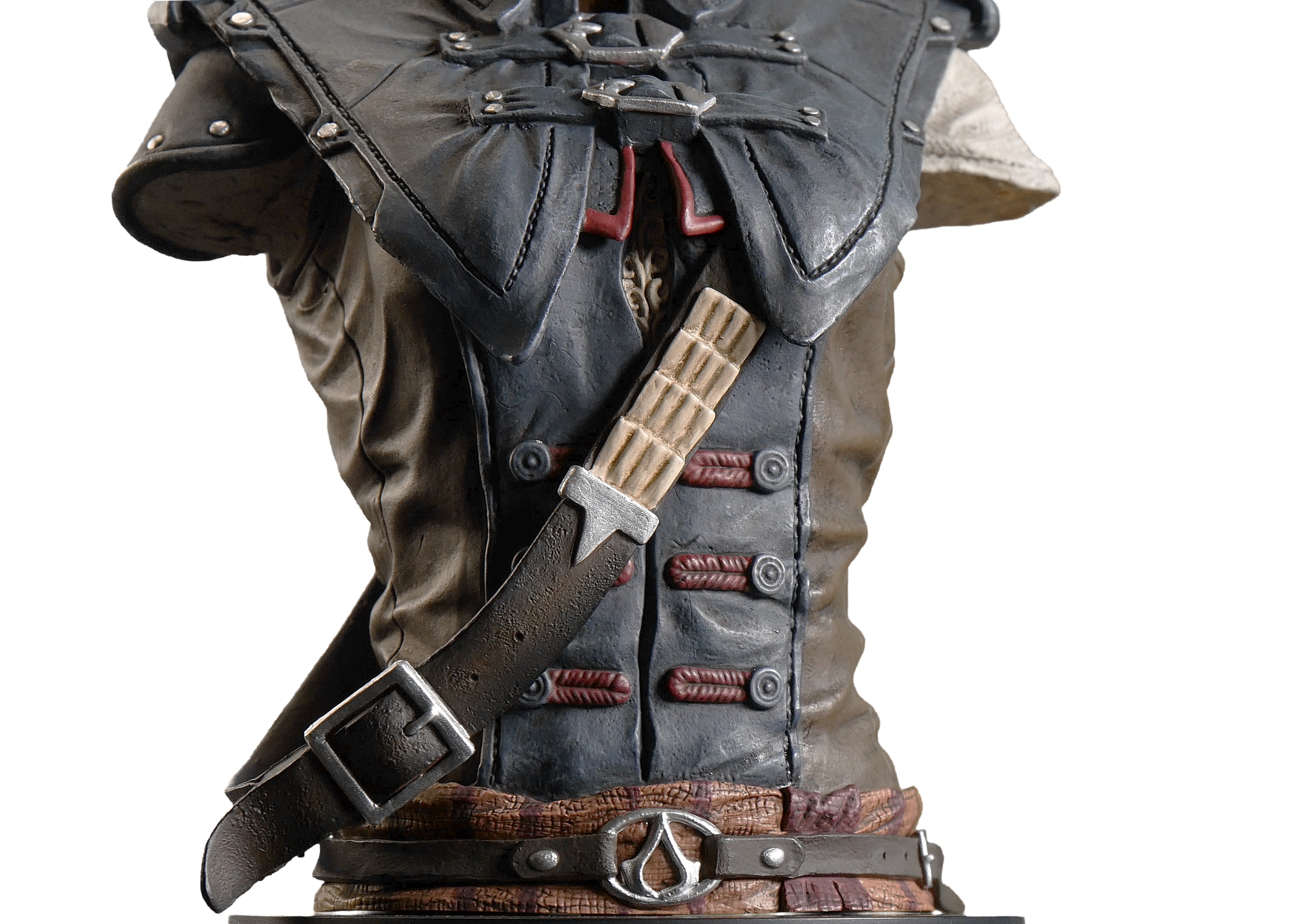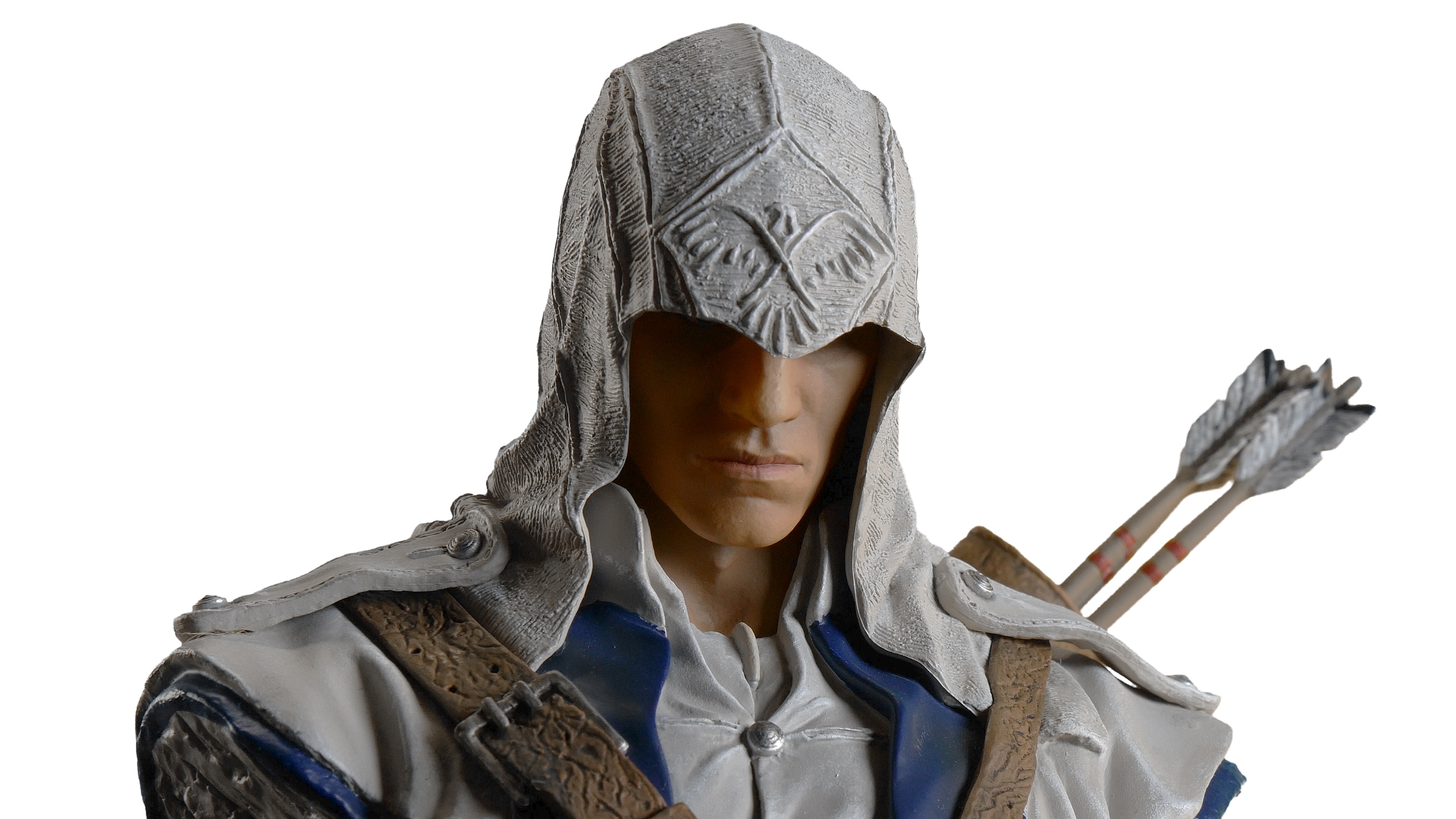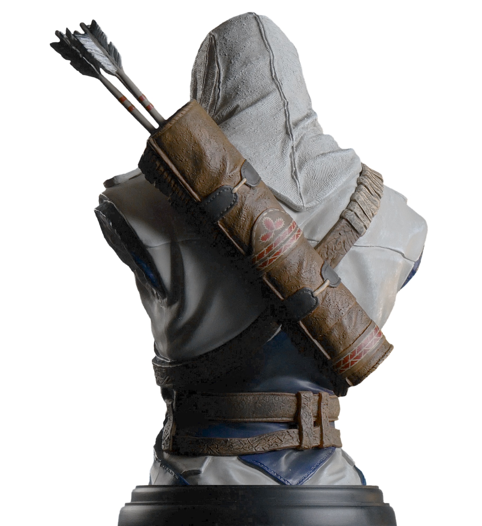 Sur son socle amovible, le buste de 19cm de Connor reproduit avec fidélité tant les tissus que les textures métalliques. Connor porte également son carquois.
