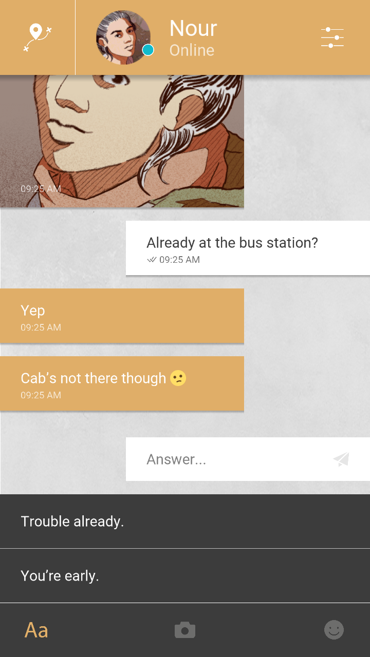 Les joueurs découvriront le périple de Nour. Une migrante syrienne en route vers l’Europe, à travers les yeux de Majd, son mari resté au pays. Grâce à leurs smartphones, l’unique moyen de communication du couple, les joueurs pourront prendre des nouvelles de Nour par messages texte. Ou tenter de l’aider à surmonter les périls rencontrés en chemin. Et ainsi découvrir l’une des multiples fins du jeu.