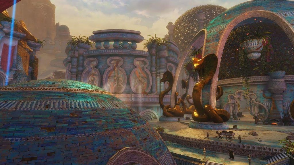 Path of Fire nous offres également un nouveau hall de Guilde, digne des Mille-et-Une Nuits. Son architecture rappelle la noblesse d’Elona dans Nightfall.