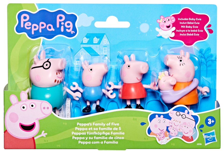 Le coffret cinq figurines permet de réunir Maman Pig, Papa Pig, Peppa, George et Evie installée dans son porte-bébé. Celui-ci est interchangeable et peut être porté par les deux parents.