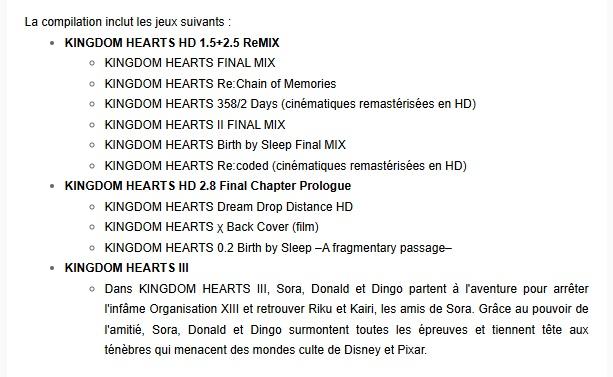 - Kingdom Hearts HD 1.5 + 2.5 ReMIX (soit 6 titres déjà, dont KH1, KH2, Birth by Sleep, Chain of Memories…)