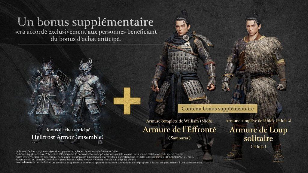 Toutes les versions incluent un bonus d’achat anticipé disponible pendant une durée limitée sur le PlayStation Store et Steam. Les chasseurs de bonnes affaires profiteront aussi d’une réduction de 90 % sur Nioh Complete Edition sur Steam. Pour découvrir la saga à petit prix, donc.