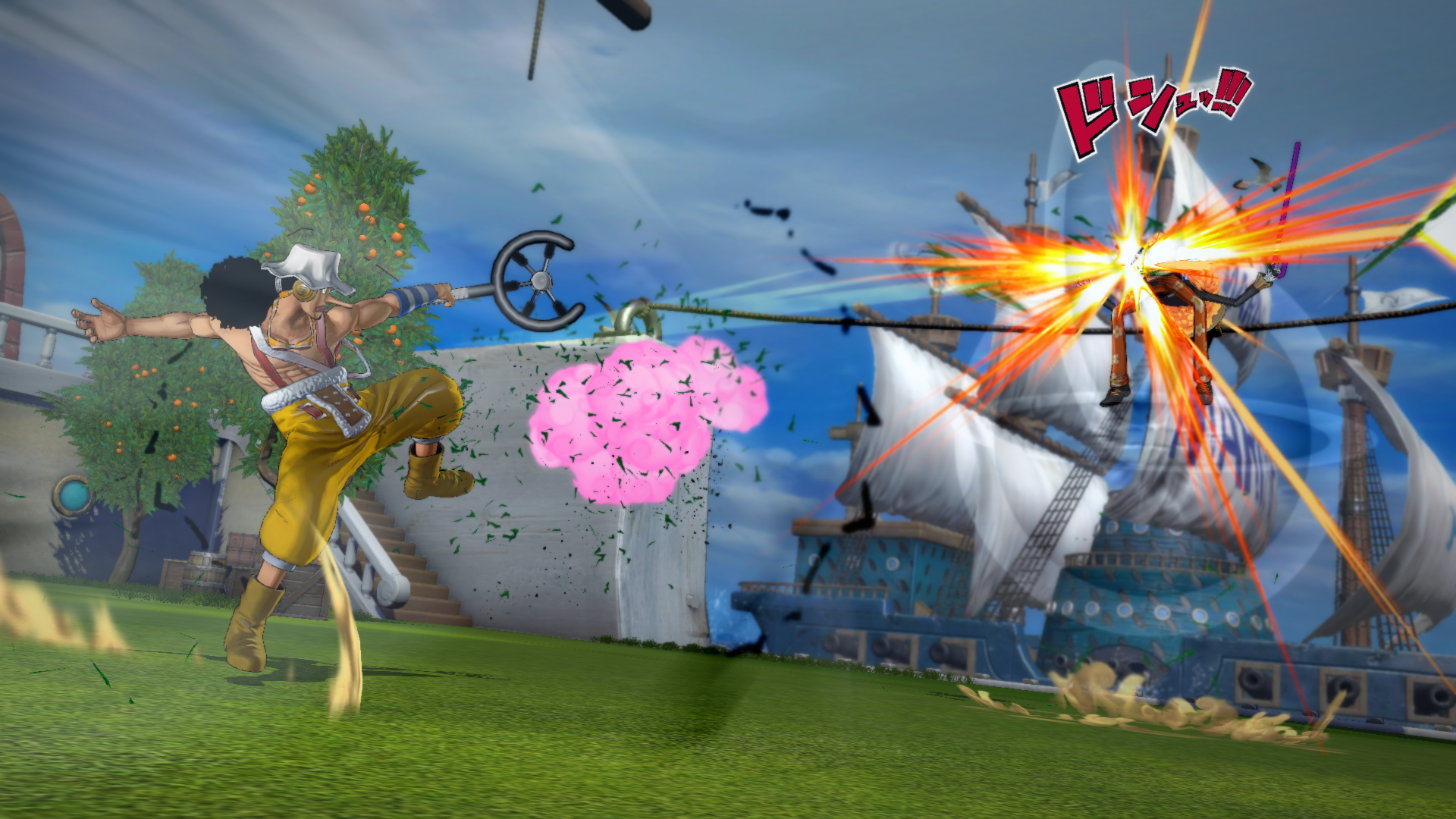 On a déjà abordé les questions du casting (j’aurais pu aussi parler du nombre d’arènes assez limité) ou du gameplay simplifié, parlons maintenant de la technique. Certes, le jeu est très joli à regarder, avec une modélisation excellente des personnages, et une ambiance qui vous replonge dans celle des animés. Pas de doute, les fans de Luffy vont se « régaler les yeux ». Encore que…