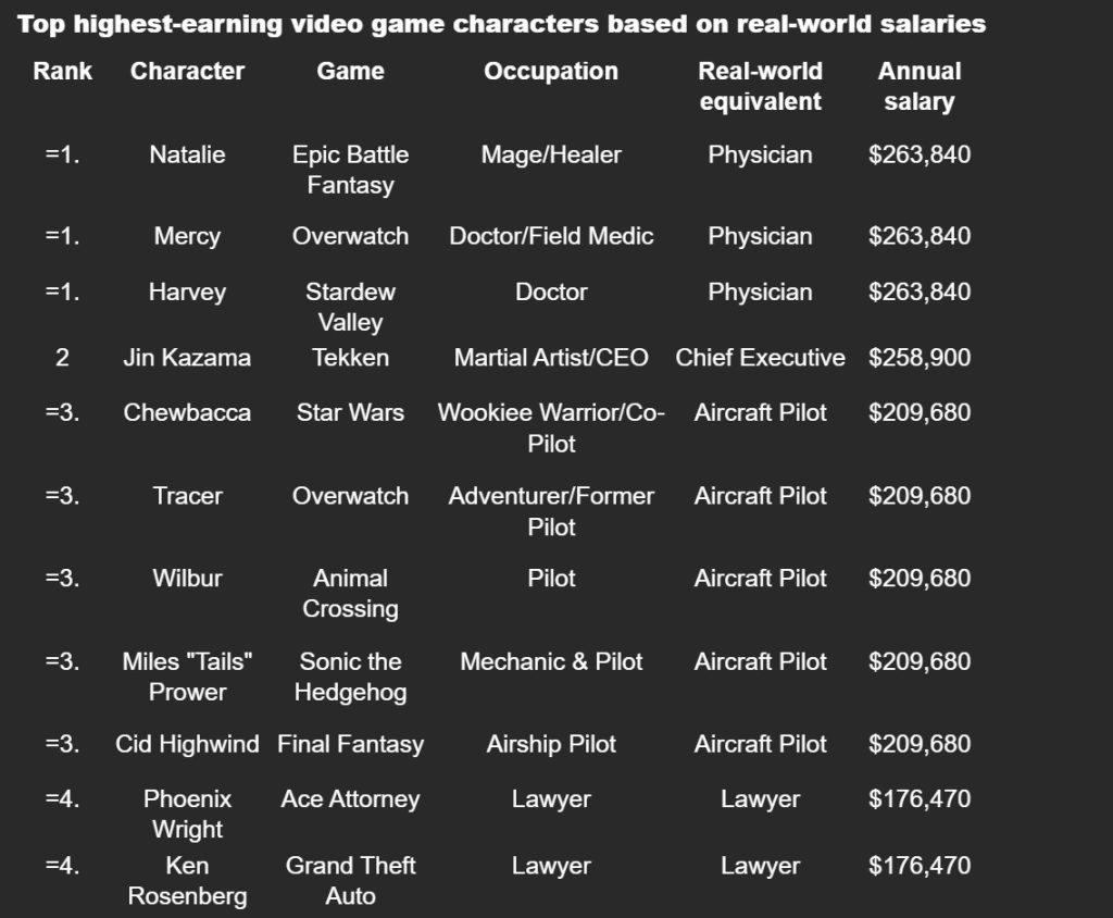 Des personnages qui travaillent comme pilotes ou ingénieurs de vol occupent les cinq postes suivants. Et la troisième marche du podium. Tous gagnant 209 680 $ par an (179 317€). Ce groupe comprend Chewbacca des jeux Star Wars ; Tracer d’Overwatch ; Rodrigue d’Animal Crossing ; Miles « Tails » Prower de Sonic the Hedgehog ; Et Cid Highwind de Final Fantasy.