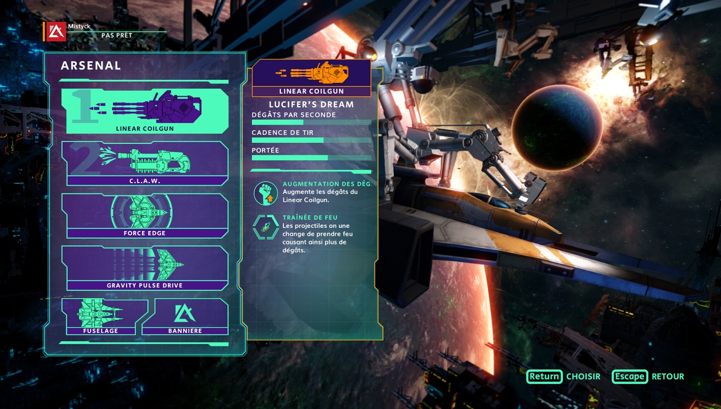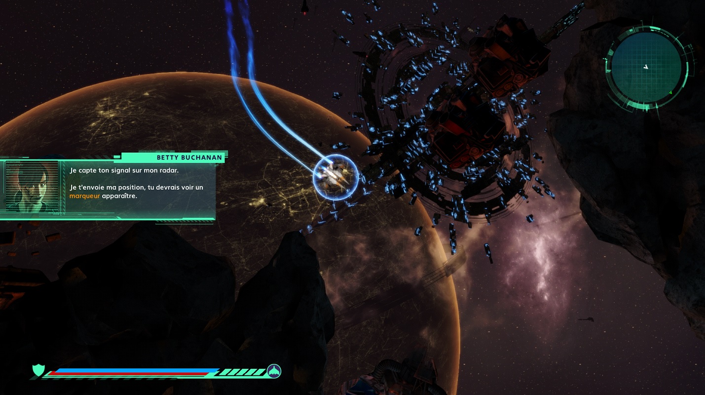 Notre vaisseau possède deux armes : le tir en rafale et le tir groupé, ce qui nous permet de mieux gérer les combats. Le joueur dispose également d’un grappin pour ouvrir des coffres, remorquer des objets, des vaisseaux mais aussi pour hacker cet IA extraterrestre. Mais aussi, et surtout, vous disposez d’un bouclier.