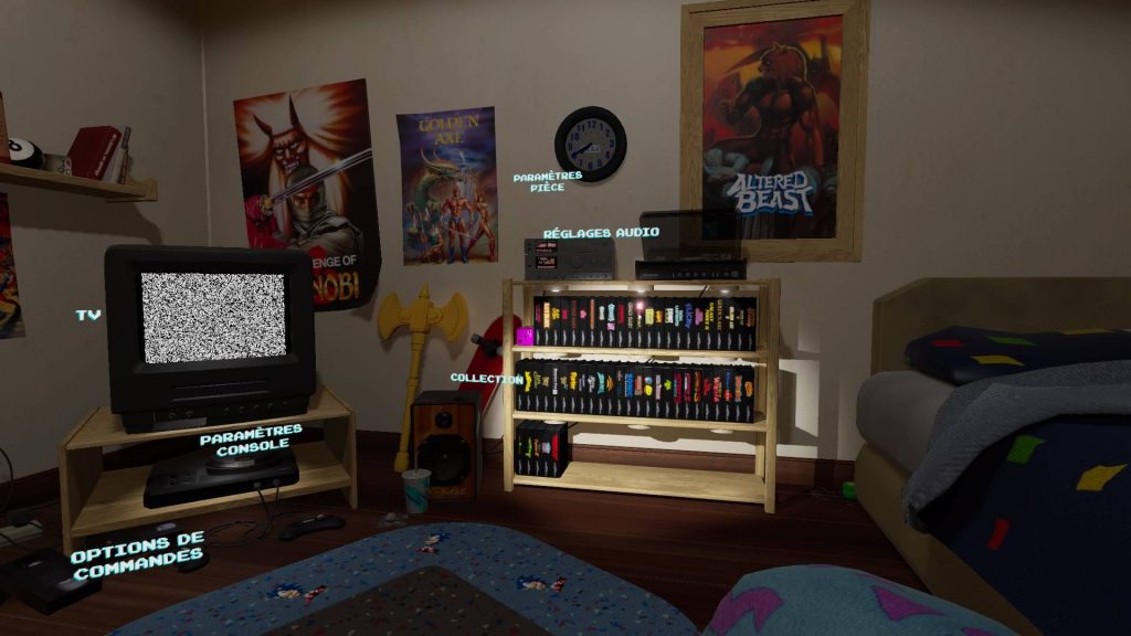 Pour une fois, je tiens à saluer l’effort de mise en situation de cette compilation ! Quand beaucoup se seraient contentés de proposer un menu déroulant avec tous les titres, Sega propose ici un vrai cadre ! Une chambre d’ado des années 90, avec ses posters, son lit en vrac, ses magazines qui traînent, et sa bonne vieille TV cathodique qui trône au milieu de la chambre ! Pour peu, j’aurais presque envie de réviser mon histoire-géo en regardant le Club Dorothée !