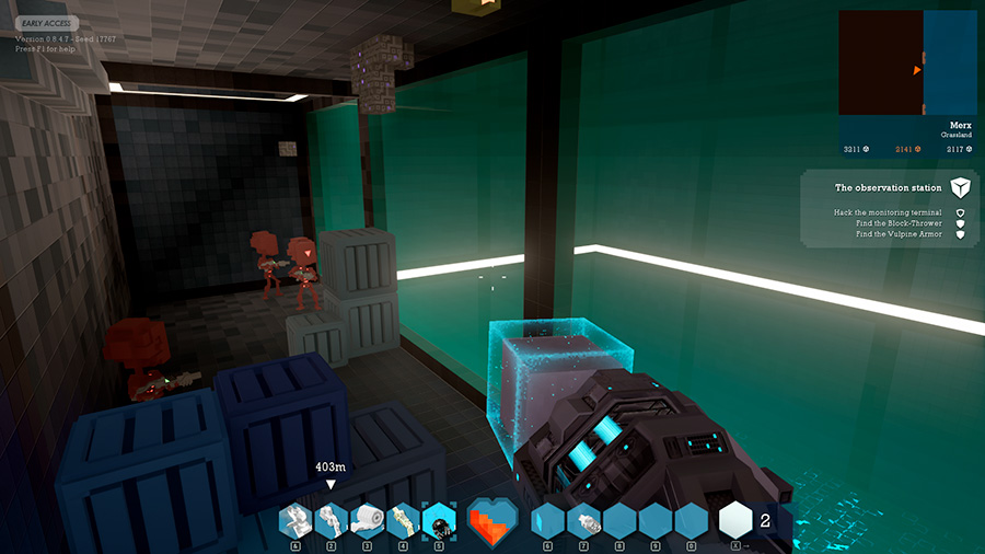 Les joueurs découvriront un monde voxel empreint d’une atmosphère évolutive, où la menace latente de l’Imperium Machina les poussera à faire bon usage de leur jetpack et lance-bloc.