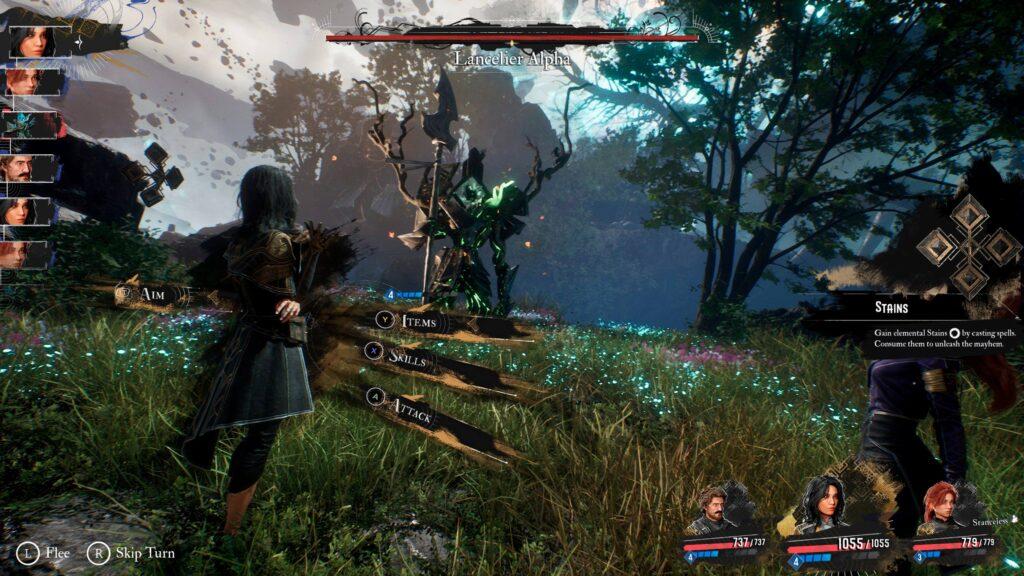 Si vous êtes familier des J-RPG, alors, vous avez sans doute l’habitude d’utiliser de la magie grâce à des Points de Mana ! Pas dans Clair Obscur ! Ici, on va plutôt parler d’un système basé sur des Points d’Action (ou PA). Vos compétences et sorts magiques vont venir pomper des PA, qui peuvent cependant être restaurés en accomplissant certaines actions. Ce qui va vous obliger à adopter une approche tactique pour maximiser l’effet de vos compétences en combat. Par ailleurs, certains personnages, comme Lune, disposent de mécaniques qui leur sont propres : le système de taches. Grâce à cette mécanique, ils peuvent accumuler différents éléments qui peuvent être combinés pour améliorer leurs attaques magiques. Un coup à prendre !