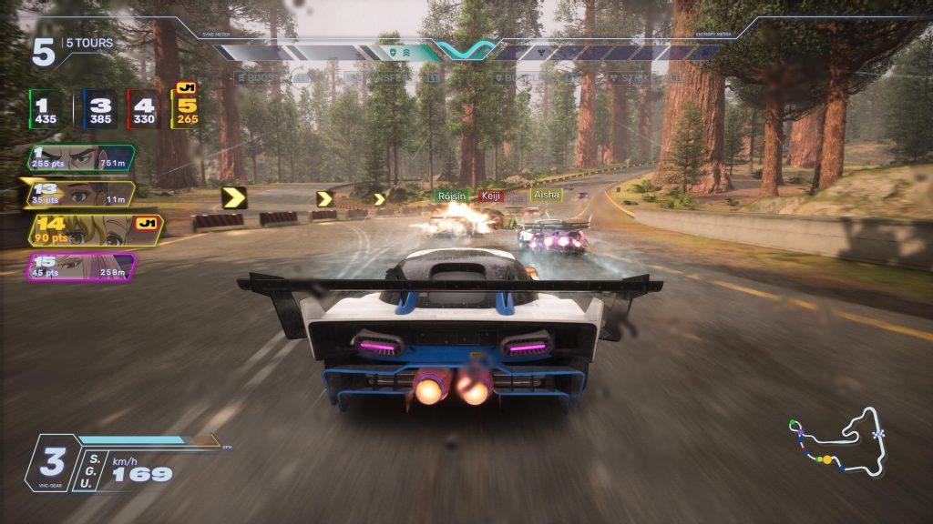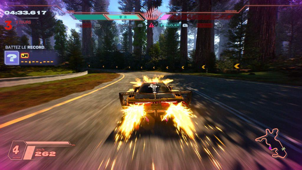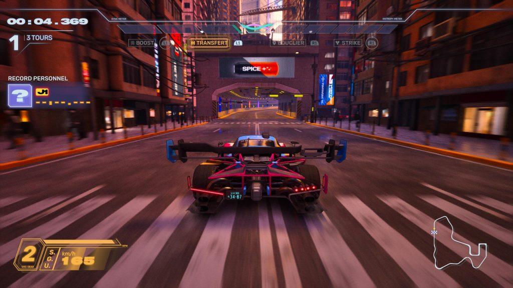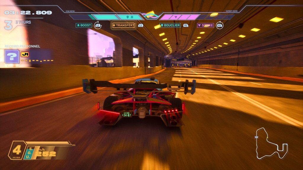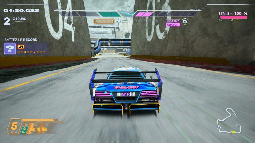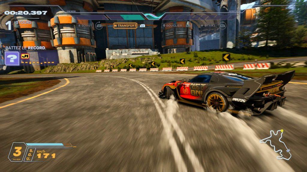 Si chaque voiture dispose d’une capacité signature, le système qui nous intéresse plus particulièrement est le système ECHO, dont tous les participants bénéficient. Il utilise deux ressources appelées SYNC et ENTROPY. La première, la Synchronisation, se charge lorsque vous passez vos vitesses dans le bon timing (avec la commande Transfert, une boîte manuelle quoi), vous permettant d’accumuler du boost. La jauge de droite, Entropie, va développer deux commandes, une offensive et une défensive : SHIELD est évidemment un bouclier momentané, tandis que STRIKE est un boost qui fait exploser tout concurrent qui vous touche quand il est activé. Et si vous ne touchez pas à votre jauge Entropy et laissez ses quatre segments se remplir, vous obtenez un OVERDRIVE. Un état de surpuissance qui vous fait accélérer, explose les malheureux sur votre chemin mais… Vous pulvérise si vous touchez un mur.