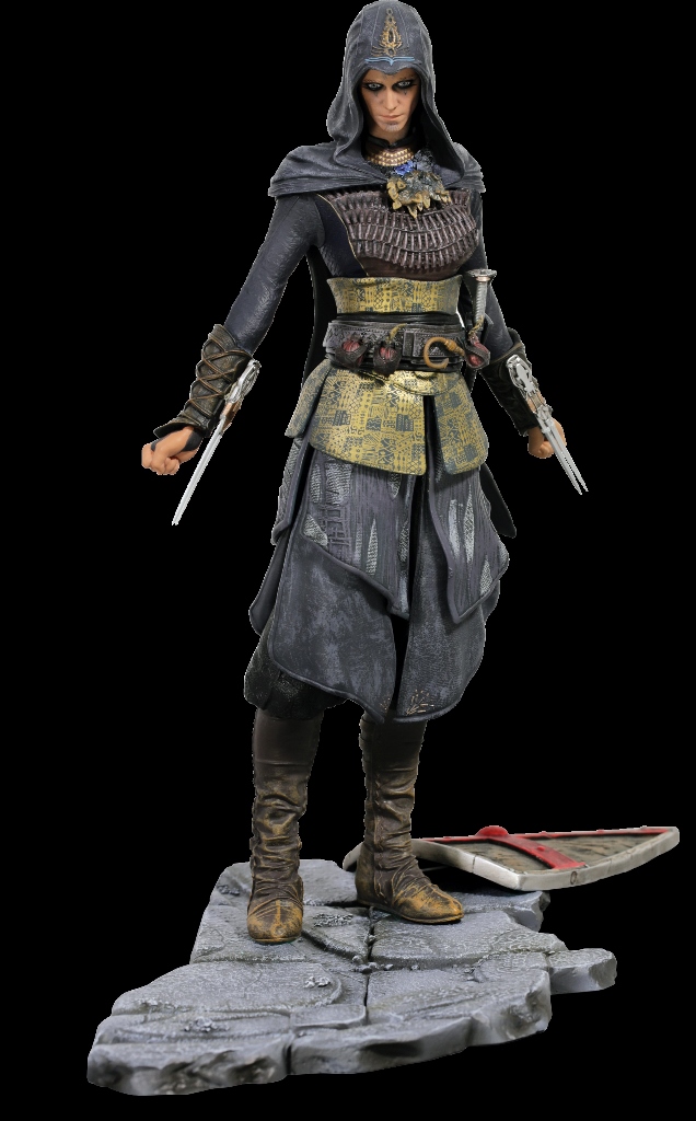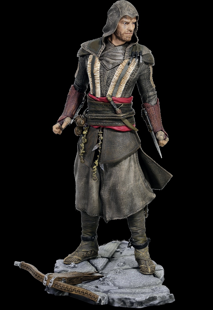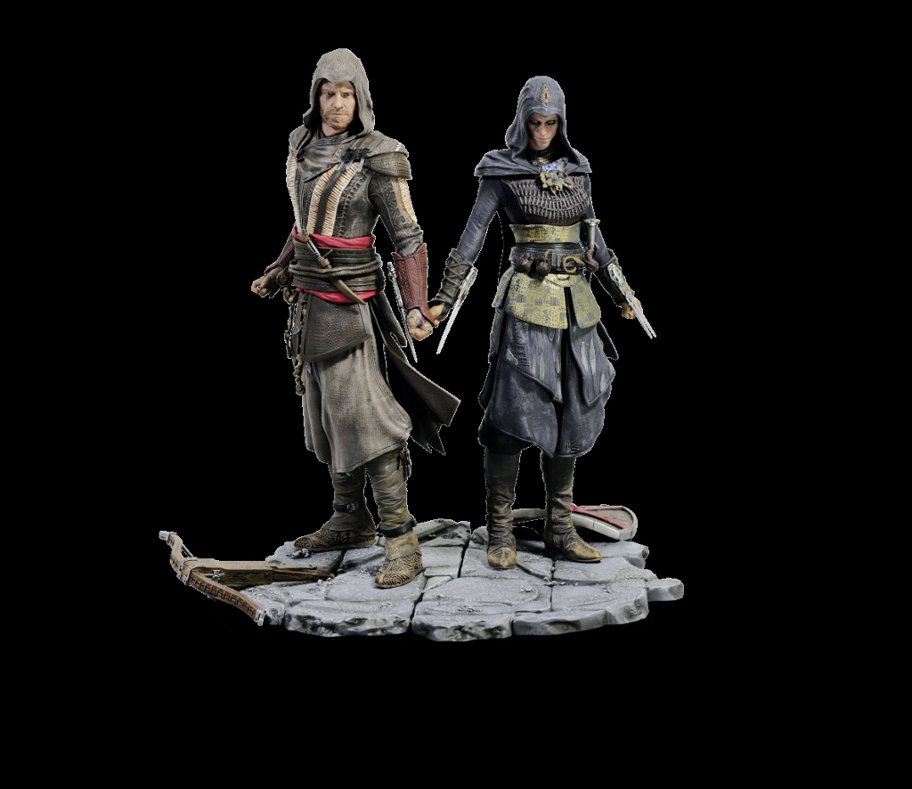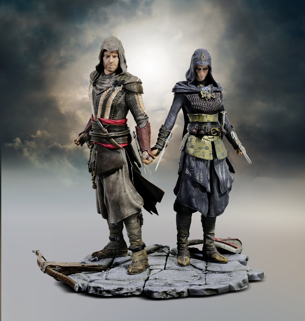 Les figurines finement détaillées d’Aguilar et Maria représentent les deux héros du film, et mesurent 24 et 23 centimètres. Ils portent des vêtements traditionnels d’Assassins, et leurs visages ont été réalisés grâce à des scans 3D des acteurs Michael Fassbender et Ariane Labed.